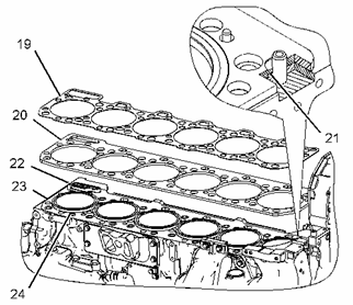 從缸體中的定位銷上卸下 O 形密封圈 (21) 。