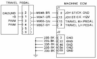 將萬用表表筆引線插入左履帶行駛位置踏板傳感器接頭的背面,并測量觸點 1(導線 M947-OR)和觸點 2(導線 M948-BR)間的電壓。