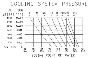 溫度和壓力協(xié)同作用。在對(duì)冷卻系統(tǒng)的故障進(jìn)行診斷時(shí),必須檢查溫度和壓力。冷卻系統(tǒng)的壓力影響冷卻系統(tǒng)溫度。例如,請(qǐng)參閱圖1。圖中顯示了水的沸點(diǎn)(蒸汽)和高于海平面的高度對(duì)壓力的影響。