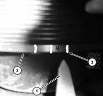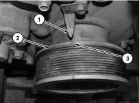 順時(shí)針緩慢轉(zhuǎn)動(dòng)曲軸,使在步驟8中作的減振器或皮帶輪(2)上的標(biāo)記與指針(1)的尖部對(duì)齊。此時(shí)1號(hào)活塞位于壓縮沖程上止點(diǎn)。參考圖2和圖3。