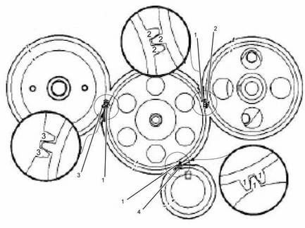 卡特彼勒3064/6發(fā)動機正時齒輪 (1)惰輪 (2)凸輪軸齒輪 (3)噴油泵驅(qū)動齒輪 (4)曲軸齒輪 |