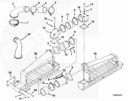 K50 康明斯發(fā)動(dòng)機(jī)的中位安裝中冷器殼體已經(jīng)經(jīng)過改進(jìn)。殼體已經(jīng)經(jīng)過改進(jìn),以便安裝十字螺栓,該螺栓能否防止由于溫度和內(nèi)部壓力造成殼體膨脹而泄漏。對殼體進(jìn)行改進(jìn)以便安裝十字螺栓的步驟包含在本手冊的這一部分中。
