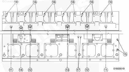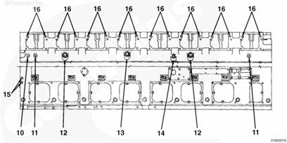 對缸體進(jìn)行了改動以便能夠安裝較長的缸蓋螺釘。以前的康明斯發(fā)動機(jī)必須使用長度為 171 mm [6.73 in] 的螺釘?,F(xiàn)在的康明斯發(fā)動機(jī)必須使用長度為 203 mm [8.00 in] 的螺釘。短螺釘可用于維修。這些螺釘都是鍍鎘的(銀色或金色)。必須將這些短螺釘擰緊至 353 N•m [260 ft-lb]。如果短螺釘表面具有 lubrite 鍍層,而且顏色是黑色,則必須予以更換。203 mm [8 in] 螺釘只能使用 lubrite 鍍層。555 N•m [409 ft-lb] 扭矩必須施加在這些螺釘上。K50 康明斯發(fā)動機(jī)總是使用 203 mm [8.00 in] 螺釘。