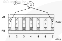 K38 康明斯發(fā)動機(jī)上的主軸承蓋編號到“7”,而 K50 康明斯發(fā)動機(jī)上則編號到“9”。將每個蓋安裝到正確位置中?!?”號蓋安裝在缸體前部。蓋中的軸承定位舌槽必須位于缸體中的槽的同一側(cè)。 |