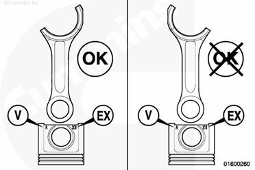 由于氣門套位于活塞頂部,QSK78鍛造鑄鐵(FCD)活塞必須以特定的方向安裝?!癊X”標(biāo)記位于連桿柄的長(zhǎng)側(cè),而“V”標(biāo)記位于連桿柄的短側(cè)。