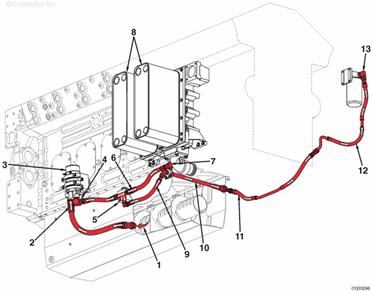 來自機(jī)油油底殼的機(jī)油供應(yīng) 前置機(jī)油泵進(jìn)口 預(yù)潤滑機(jī)油泵 前置機(jī)油泵出口 機(jī)油歧管 至機(jī)油冷卻器的前置機(jī)油供應(yīng) 單向閥 機(jī)油冷卻器芯 至左排的前置機(jī)油供應(yīng) 機(jī)油輸送管 來自右排的前置機(jī)油供應(yīng) 至燃油泵驅(qū)動(dòng)裝置機(jī)油濾清器座的前置機(jī)油供應(yīng)單向閥。