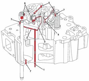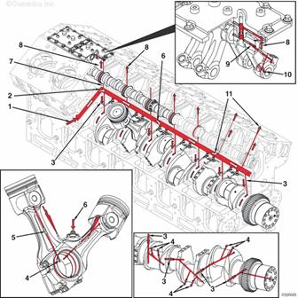 來自濾清器座的機(jī)油供應(yīng) 主機(jī)油油道 至主軸承和曲軸的機(jī)油供應(yīng) 從曲軸流至連桿的機(jī)油 至活塞銷的機(jī)油供應(yīng) 至活塞冷卻噴嘴的機(jī)油供應(yīng) 至凸輪軸和凸輪軸隨動(dòng)件的機(jī)油供應(yīng) 至凸輪軸隨動(dòng)件的機(jī)油供應(yīng) 至凸輪軸隨動(dòng)件軸和滾筒的機(jī)油供應(yīng) 至凸輪軸隨動(dòng)件滾筒的機(jī)油供應(yīng) 至搖臂的機(jī)油供應(yīng)。