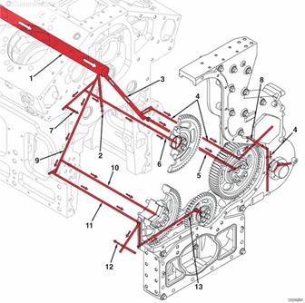 康明斯QSK95主機(jī)油油道 至 1 號主軸承的機(jī)油供應(yīng) 至燃油泵惰輪、燃油泵驅(qū)動(dòng)裝置機(jī)油濾清器座和左排附件驅(qū)動(dòng)裝置襯套的機(jī)油供應(yīng)(如果配備) 至齒輪室中的燃油泵驅(qū)動(dòng)裝置襯套、燃油泵驅(qū)動(dòng)裝置中的襯套和左排附件驅(qū)動(dòng)裝置襯套的機(jī)油供應(yīng) 至康明斯QSK95燃油泵惰輪的機(jī)油供應(yīng) 至凸輪軸復(fù)合惰輪的機(jī)油供應(yīng) 至右排附件驅(qū)動(dòng)裝置的機(jī)油供應(yīng)(如果配備) 至燃油泵驅(qū)動(dòng)裝置中的襯套的機(jī)油供應(yīng) 至水泵、水泵惰輪和機(jī)油泵惰輪的機(jī)油供應(yīng) 至水泵惰輪的機(jī)油供應(yīng) 至康明斯QSK95水泵和機(jī)油泵惰輪的機(jī)油供應(yīng) 至康明斯QSK95水泵的機(jī)油供應(yīng)