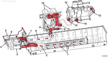 來自康明斯QSK95缸體的機(jī)油 至排氣門搖臂軸的機(jī)油供應(yīng) 至進(jìn)氣門搖臂軸的機(jī)油供應(yīng) 至搖臂軸的機(jī)油供應(yīng) 至搖臂腳的機(jī)油供應(yīng) 至搖臂調(diào)節(jié)螺釘和推管的機(jī)油供應(yīng) 排放至油底殼的機(jī)油。