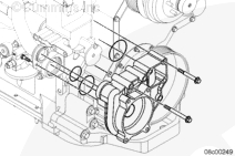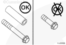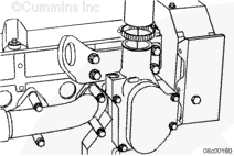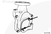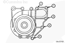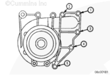 使用清潔的康明斯發(fā)動機(jī)機(jī)油潤滑所有水泵螺栓的螺紋和螺栓端頭底部。安裝水泵和兩個下部螺栓。擰緊螺栓,將水泵固定到位。