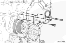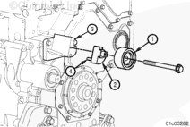 利用導(dǎo)向適配器上的定位銷(4)(如果配備),將惰輪皮帶輪(1)和導(dǎo)向適配器(2)軸與皮帶張緊輪支架(3)對正。使用一個墊圈和螺栓,將皮帶惰輪皮帶輪和軸安裝在皮帶惰輪支架上。擰緊螺栓。扭矩值: 30 n.m [25 ft-lb]。安裝防塵密封圈。