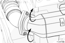 在 V 形帶箍的內(nèi)側(cè)涂一層高溫防粘結(jié)復(fù)合劑,以確保對帶箍適當(dāng)加載。在排氣歧管前部安裝 v 形帶箍。在與排氣歧管前部分連接的 EGR 冷卻器導(dǎo)引端安裝一個新的密封墊。將 EGR 冷卻器裝到機(jī)油冷卻器總成的雙頭螺柱上。