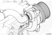 注: 要拆卸和安裝水泵,早期的、在中間鋁制皮帶張緊器惰輪支架上沒有縫槽的發(fā)動機(jī)需要拆下減振器。
