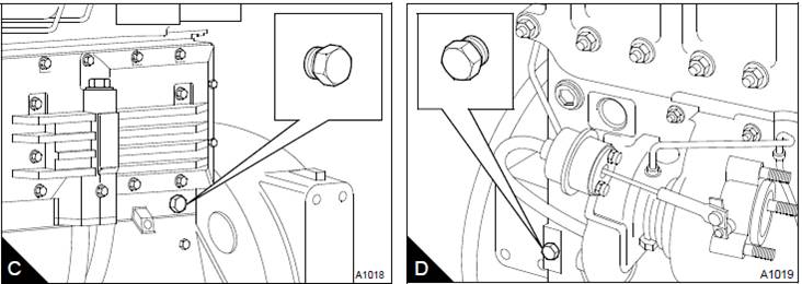 4從Perkins1000/4/6缸缸體的側(cè)面拆下排放螺塞(C或D)以便排放發(fā)動(dòng)機(jī)。確保排放孔未被堵塞。