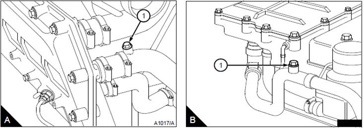 3對于裝配中冷器的發(fā)動(dòng)機(jī):打開垂直中冷器的放氣螺釘(A1)或水平中冷器的放氣螺釘(B1)。這將確保從中冷器中排出所有冷卻液。