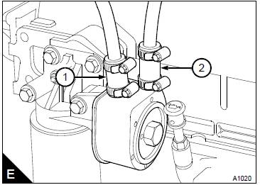 6如果Perkins1000/4/6缸機(jī)油冷卻器安裝在濾清器座上而不是缸體上,那么也必須對其進(jìn)行排放和沖洗。為此,斷開冷卻器頂部的軟管(E1和E2)并通過出口接頭(E1)沖洗機(jī)油冷卻器直到清水從進(jìn)口(E2)流出。