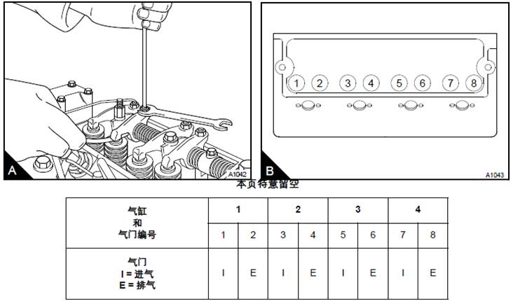 3設(shè)置1號氣缸的氣門(B1和B2)。然后檢查/調(diào)整4號氣缸的氣門(B7和B8)間隙。