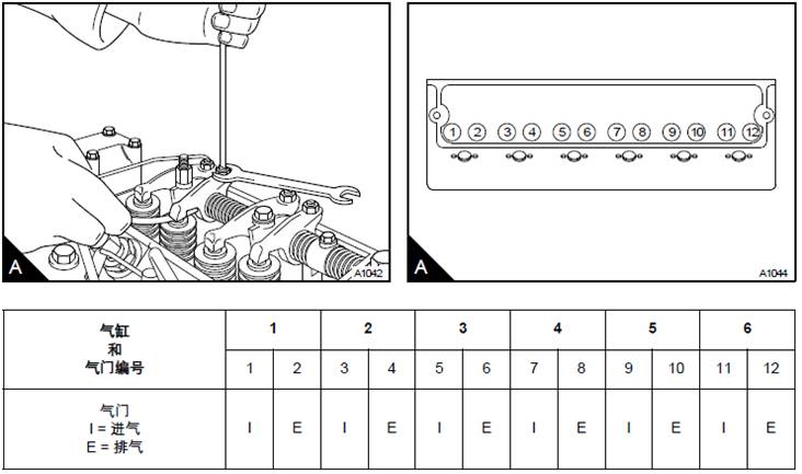 4設(shè)置1號氣缸的氣門(B1和B2)。然后檢查/調(diào)整6號氣缸的氣門(B11和B12)間隙。