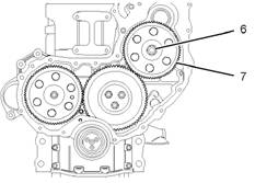2.松開鎖緊螺釘(5)。轉動隔套(6),以便將鎖緊螺釘(5)擰緊抵到噴油泵的軸上。逆時針方向轉動噴油泵齒輪來消除齒隙。將鎖緊螺釘(5)擰緊至扭矩17N·m(13lbft)。