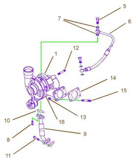 7.卸下中空螺栓(5)。從渦輪增壓器(1)上拆下供油管組件(6)和墊圈(7)。棄置墊圈(7)。如有必要,從缸體上拆下供油管組件(6),并棄用墊圈。
