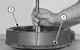 5.將飛輪(3)和齒圈(4)放在適當(dāng)?shù)闹紊?。用錘和鑿,從飛輪(3)上拆下齒圈(4)。