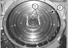 3.拆下其余將飛輪(3)固定到曲軸上的調(diào)整螺釘(1),再拆下飛輪。