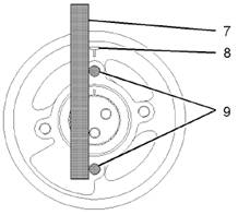 4.用頂部的“T”標(biāo)記(8)對(duì)準(zhǔn)皮帶輪,并且與發(fā)動(dòng)機(jī)的中心線成一直線,然后在曲軸上安裝皮帶輪。使用一個(gè)合適的直尺(7)靠在導(dǎo)向銷(xiāo)(9)上,以協(xié)助皮帶輪的校準(zhǔn)。