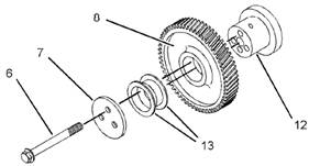 7.解體惰齒輪(8)的組件(9)和輪轂。為了解體標(biāo)準(zhǔn)組件(9),將輪轂(12)滑出惰齒輪(8).檢查惰齒輪(8)中的襯套(13)有無磨損或損壞。如有必要,從惰齒輪(8)的每側(cè)拆下襯套(13)。