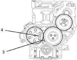 2.確保1號氣缸仍處在其壓縮沖程的上止點(diǎn)位置。如有必要,請參閱《Perkins1103/1104柴油發(fā)動(dòng)機(jī)測試和調(diào)整手冊》,“查找1號活塞的上止點(diǎn)位置”。確保安裝了曲軸正時(shí)銷(3)和凸輪軸正時(shí)銷(4)。