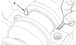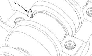 10.用清潔的發(fā)動機機油輕輕潤滑上止推墊圈(6)。將上止推墊圈(6)安裝到缸體中相應(yīng)主軸承的每側(cè)。上部止推墊圈(6)中的凹槽必須抵到曲軸上。如有必要,將曲軸移至前部或后部,以安裝止推墊圈(6)。