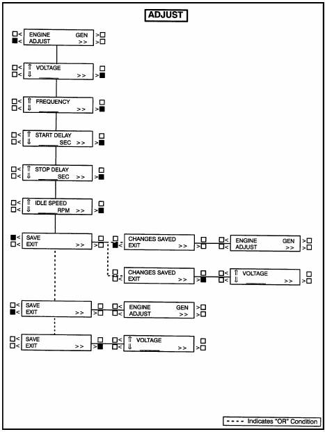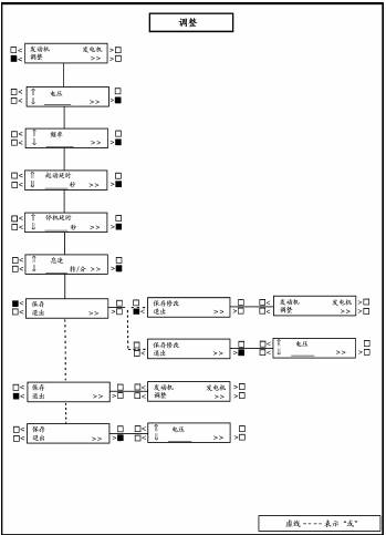 調(diào)整(ADJUST)子功能允許對發(fā)電機(jī)組輸出電壓、頻率、起動(dòng)和停機(jī)延時(shí)進(jìn)行調(diào)整。