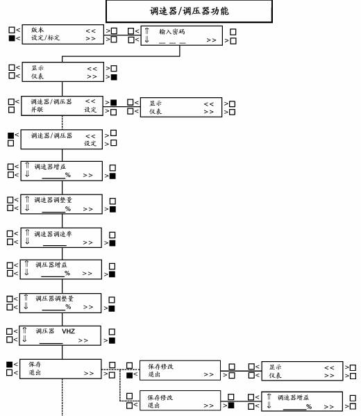 按“⇑”和“⇓”符號旁邊的按鍵以調整調速器/調壓器參數(shù),按“>>”符號旁邊的按鍵,進到下一功能。