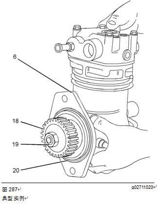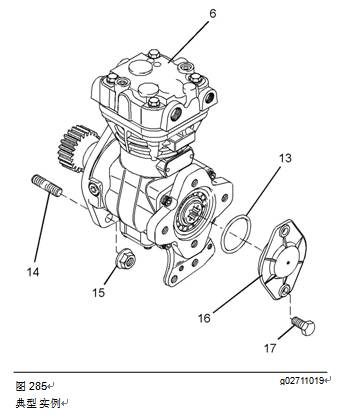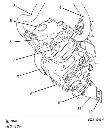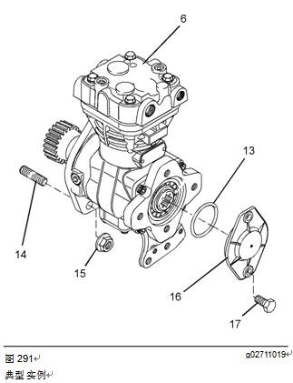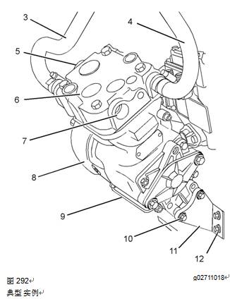 14.如果發(fā)動(dòng)機(jī)在空氣壓縮機(jī)后部配備一個(gè)液壓泵,安裝該液壓泵。有關(guān)正確的步驟,請參閱OEM信息。