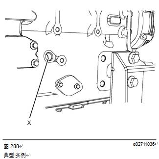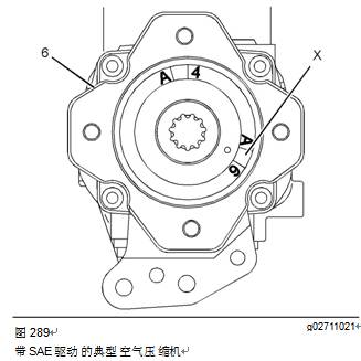 注:確保正時(shí)標(biāo)記(X)與正時(shí)標(biāo)記A6對齊。有關(guān)帶SAE驅(qū)動(dòng)的空氣壓縮機(jī),請參閱圖289。有關(guān)帶DIN驅(qū)動(dòng)的空氣壓縮機(jī),請參閱圖290。