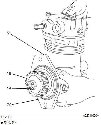3如果發(fā)動(dòng)機(jī)在空氣壓縮機(jī)后部配備一個(gè)液壓泵,卸下該液壓泵。有關(guān)正確的步驟,請參閱OEM信息。