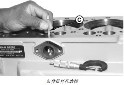 3. 檢查推桿末端環(huán)。如果磨平或凹陷,應(yīng)更換推桿,同時檢查凸輪軸凸輪緣是否磨損。(參見第 050 章的“測量凸輪軸凸輪緣高度”部分。)