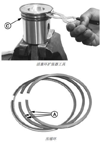 2. 將控油環(huán) (C) 裝入底部環(huán)槽,套在控油環(huán)擴張器上。安裝時,從擴張器開口方向看,活塞環(huán)缺口間隙應(yīng)位于活塞對側(cè)。