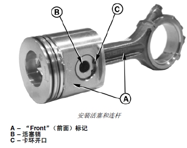 重要提示: 活塞必須安裝到原先從連桿拆下的位置,還必須使用新的活塞銷卡環(huán)。必須正確安裝活塞和連桿,這樣當(dāng)連桿長軸面向John Deere約翰迪爾強鹿柴油發(fā)動機凸輪軸一側(cè)時,活塞燃燒碗應(yīng)移向John Deere約翰迪爾強鹿柴油發(fā)動機噴油泵一側(cè)。