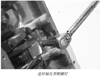 8. 安裝連桿軸瓦蓋和連桿軸瓦。安裝新帶帽螺釘并按照技術(shù)規(guī)格將其擰緊。(參見第 030 章“安裝活塞和連桿總成”部分。)