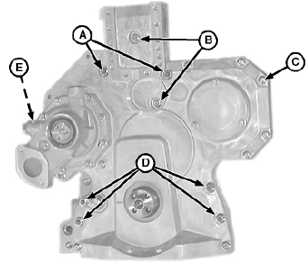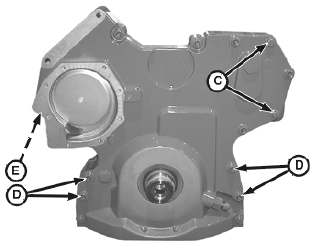 19. 拆卸正時齒輪蓋邊緣的帶帽螺釘 (C) 和John Deere約翰迪爾強鹿柴油發(fā)動機前板后面的帶帽螺釘 (E)。拆卸正時齒輪蓋。