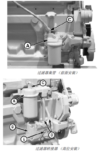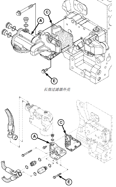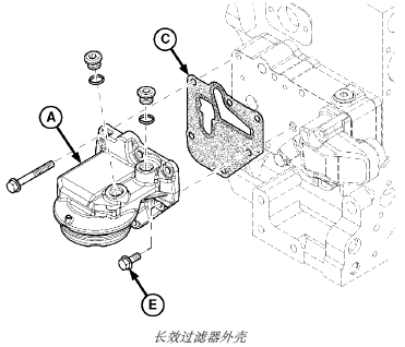 對于配備長效過濾器的John Deere約翰迪爾強鹿柴油發(fā)動機:在內 (B) 外 (A) 密封和過濾器螺紋上涂一層干凈的機油。用干凈的布子擦拭集管的兩個密封面(D 和 E)。確保防塵密封 (C)位于集管的正確位置上,并且密封翼片要與蓋槽對齊。如果損壞,更換密封。安裝機油過濾器并用手擰緊,直到貼緊防塵密封墊。密封墊接觸后不得像安裝其他過濾器一樣再擰緊 1/2 - 3/4 圈。