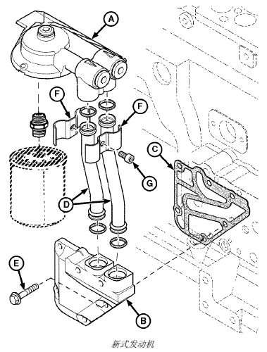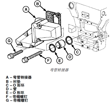 注意: 舊式John Deere約翰迪爾強鹿柴油發(fā)動機的油管 (D) 是彎管轉接器 (A) 的一部分,且不使用 O 形環(huán) (E)。確保 O 形環(huán) (C) 正確安裝在正時齒輪蓋冷卻液端口的槽中。