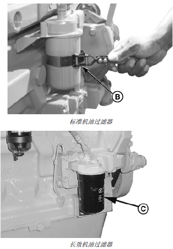 3. 使用合適的過濾器扳手拆卸機油過濾器(B 或 C)。