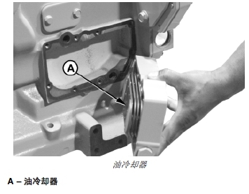 1. 檢查機油冷卻器 (A) (圖示為安裝在外殼上的冷卻器)是否有物理損傷、堵塞或造成機油與冷卻液混合的泄漏。