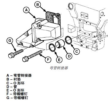 5. 安裝襯墊 (B)、O 形環(huán)(C 和 E)、油管 (D) 和彎管轉接器 (A)。用帶帽螺釘(F 和 G)將彎管轉接器固定在John Deere約翰迪爾強鹿柴油發(fā)動機上。按規(guī)格要求擰緊帶帽螺釘。