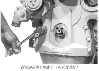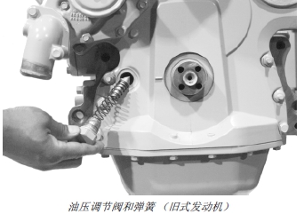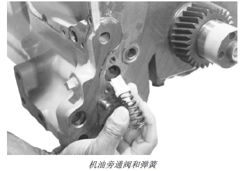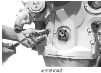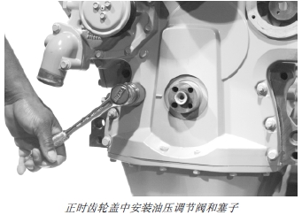 7. 將油壓調節(jié)閥、彈簧、墊圈和塞子裝入正時齒輪蓋。按技術規(guī)格要求擰緊塞子。