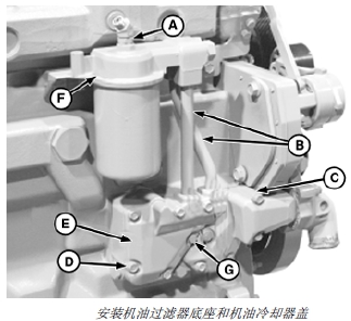 7. 安裝零部件(A、B、D、E 和 F)。(參見本章“拆卸、檢查和安裝機油過濾器底座”部分。)