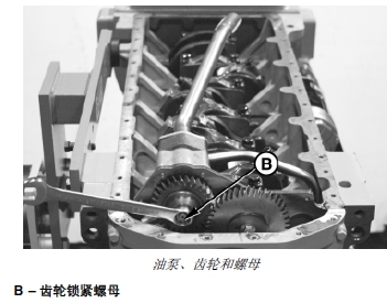 5. 從機油泵錐柄驅動軸上拆下螺母 (B),拉出齒輪。拆卸機油泵齒輪時,將螺母松開幾圈,用撬杠插入前板和齒輪之間在齒輪兩側撬動。如果用上述方法無法拆下齒輪,可松開機油泵殼體帶帽螺釘,用小鉛錘敲軸頭的螺母使齒輪受力,直到齒輪從錐柄上退下。