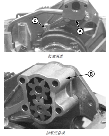 9. 拆卸下部機油泵殼體帶帽螺釘,擰下惰輪帶帽螺釘(C),然后拆下機油泵殼總成 (B)。