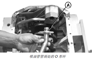 9. 在吸油管管頸處安裝新 O 形環(huán) (A)。安裝吸油管。(參見本章“拆卸、檢查和安裝油泵吸油管總成”部分。)